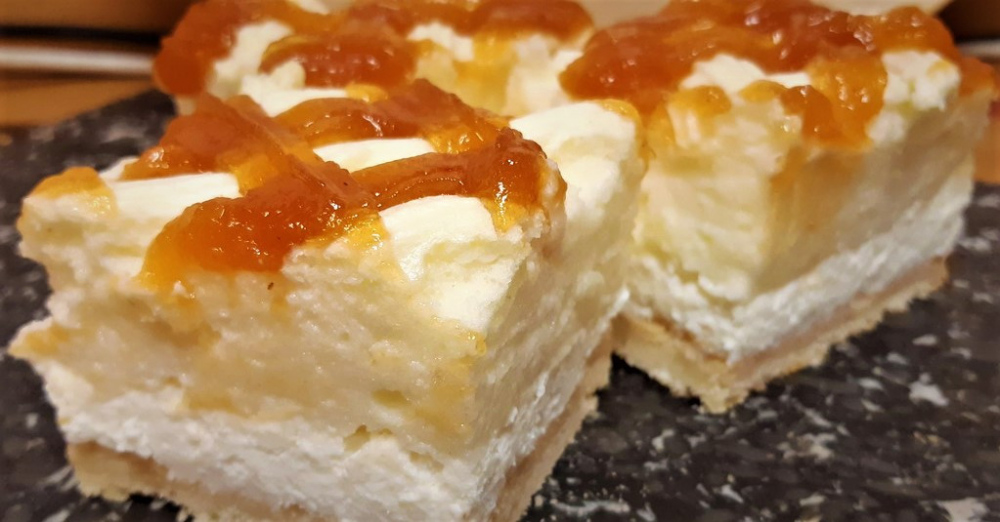 Linzerlapon túró és főzött könnyű vaníliás krém, lekvárral a tetején.